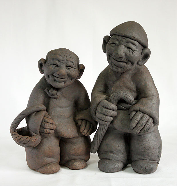 The statues of an old Chinese couple from the village. From the the expressions on their faces, it seems as if this couple had dressed up to visit relatives or to go to a county fair.